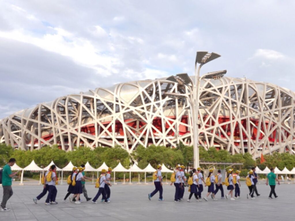 Nằm trong khu liên hợp thể thao Beijing Olympic Park, sân vận động quốc gia là công trình nổi bật nhất, được thế giới biết đến với tên gọi sân vận động Tổ chim. Công trình khiến du khách bất ngờ từ cái nhìn đầu tiên nhờ thiết kế khỏe khoắn nhưng lại có nét mềm mại. Mái vòm khổng lồ được tạo hình như hàng trăm chiếc nan thép đan vào nhau thành một tổ chim cỡ lớn giữa nền trời xanh.